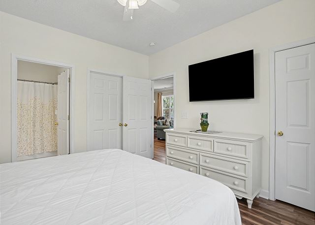 The primary bedroom boasts a king swing size bed and an ensuite bathroom with plenty of space for your personal items. The 2nd bedroom offers 2 twin beds and there is a full size bathroom in the hallway. Both bedrooms are furnished with Flat Screen TV's. There is also a washer and dryer located in the hallway for your convenience.