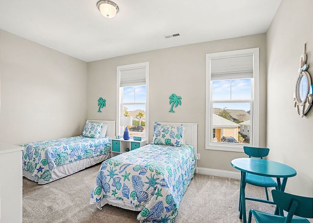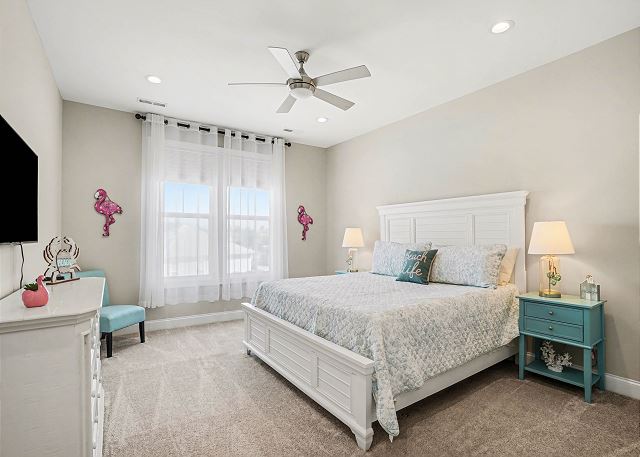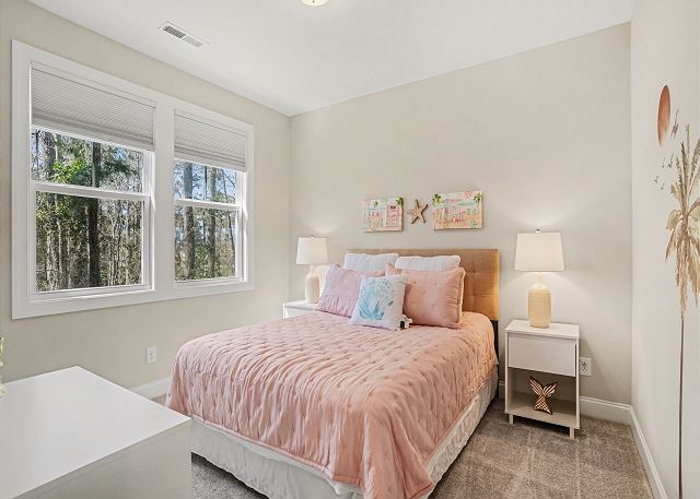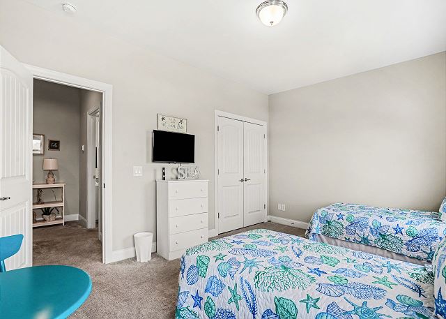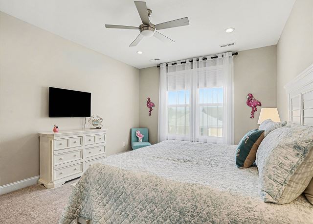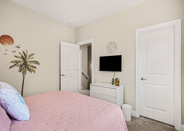 This spacious 3-bedroom, 2 and a half bathroom home offers ample space for your group to relax and unwind with four TVs. The primary bedroom features a luxurious king-size bed and an ensuite full bathroom for added comfort and convenience. The 2nd Bedroom boasts a queen size bed. The 3rd bedroom is equipped with two twin size beds. All bedrooms have flat screen smart TVs.