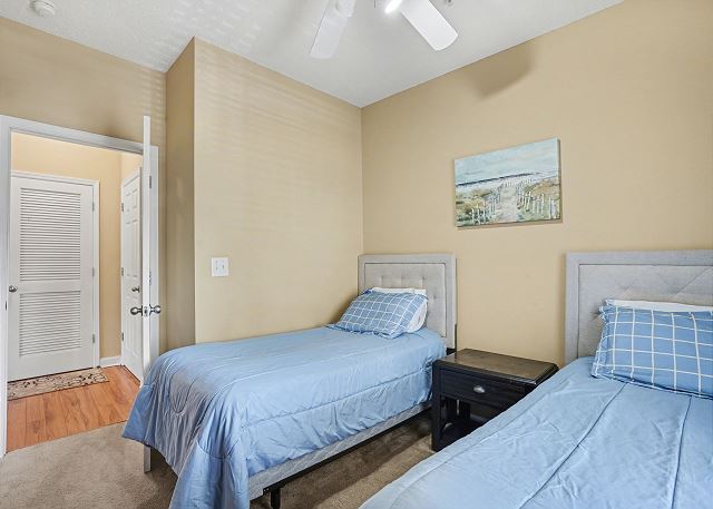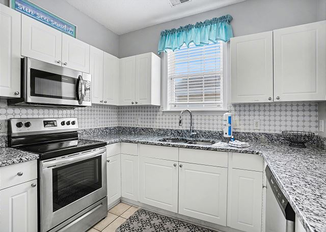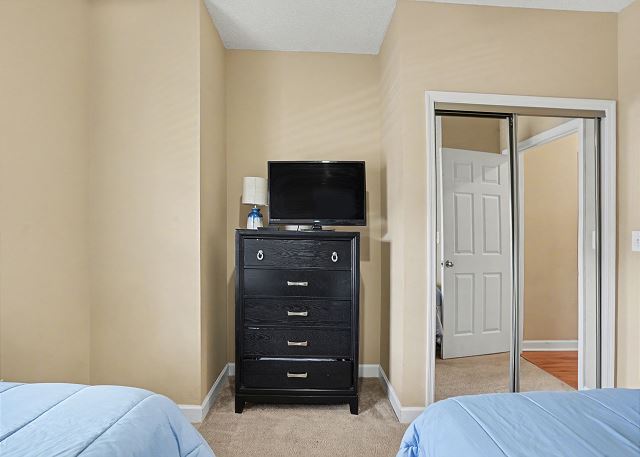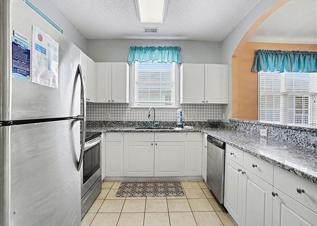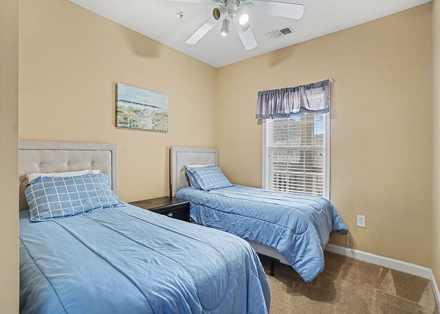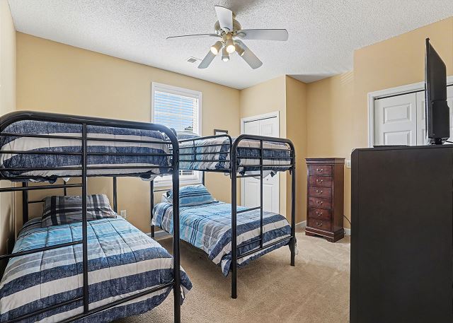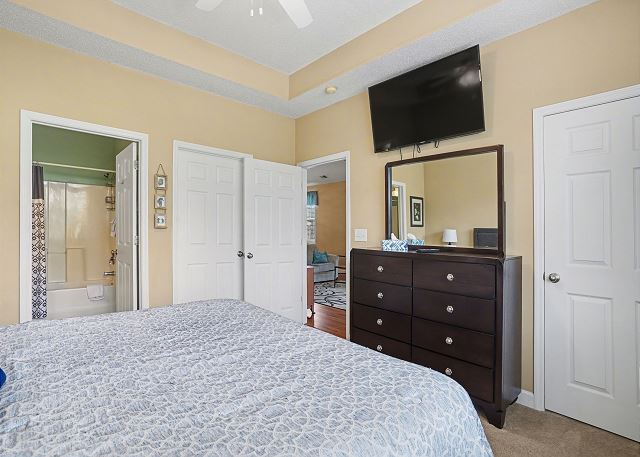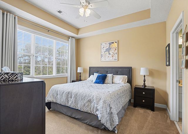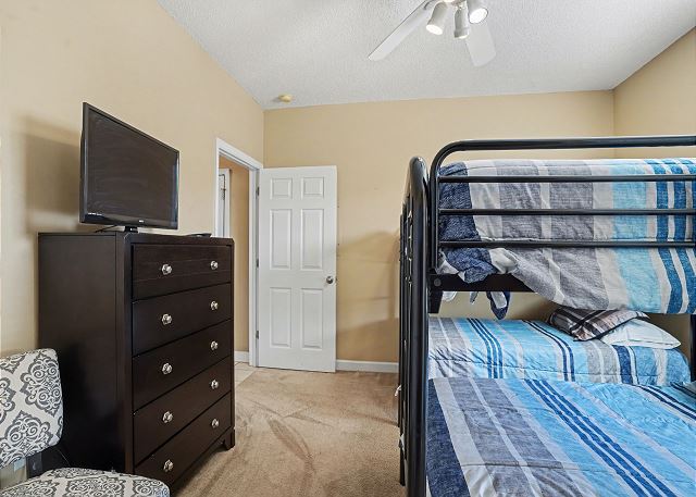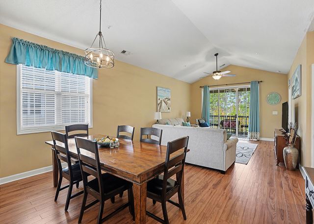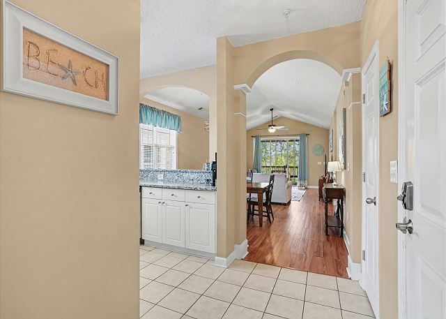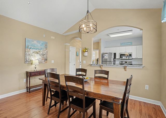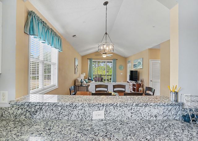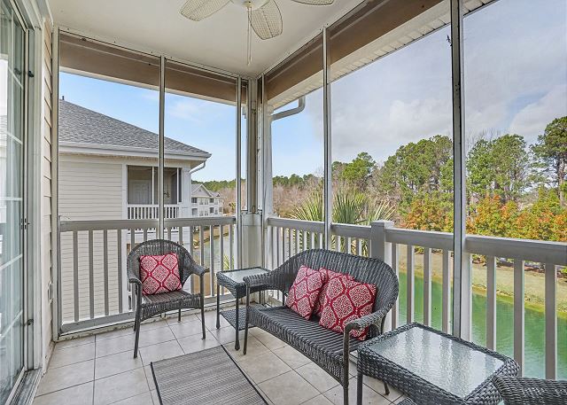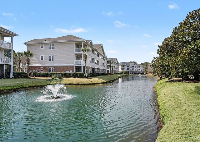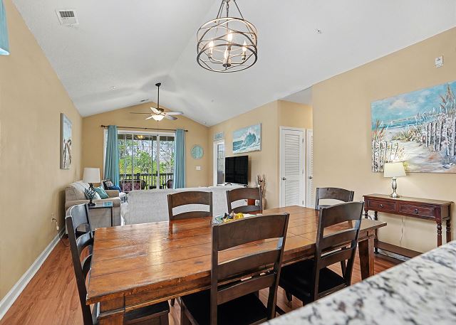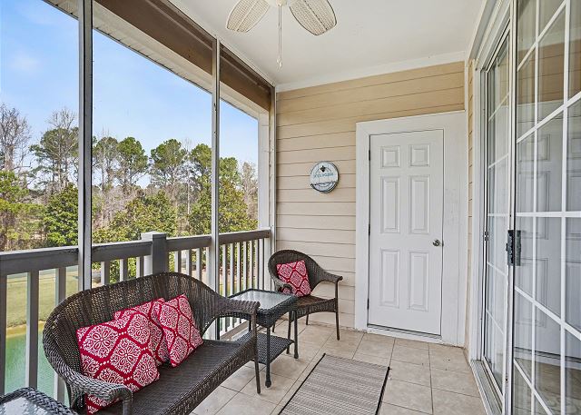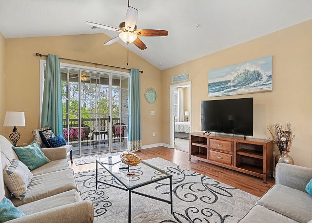 This lovely condo is beautifully decorated with everything you need to enjoy your stay. There is a great balcony to enjoy your morning coffee or afternoon cocktails. Inside, you'll find a primary suite with king bed, the second bedroom with two twin beds and the third bedroom is equipped with two bunk twin beds, ensuring a comfortable night's sleep for up to 8 guests. It is very spacious with a large kitchen, dining area and comfortable living room. The fully stocked kitchen contains everything you need to prepare delicious meals, but if you prefer dining out, numerous restaurants are just a stone's throw away. The patio off of the living room provides a wonderful view of the River Crossing Pond!