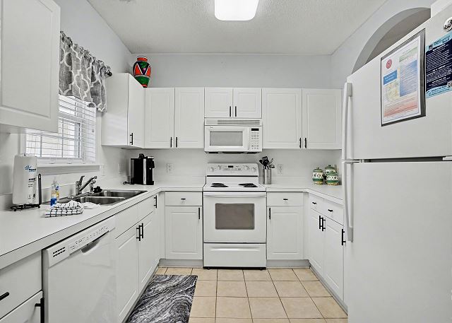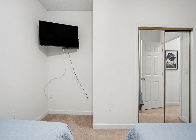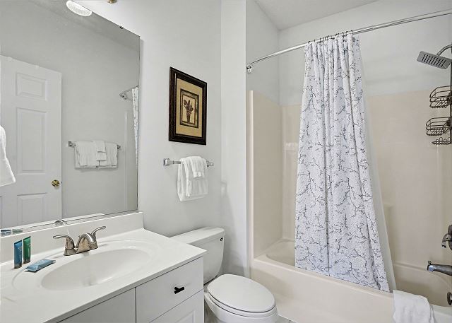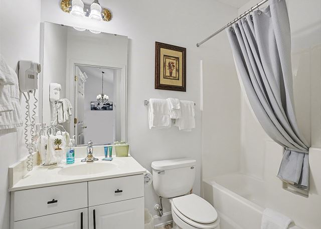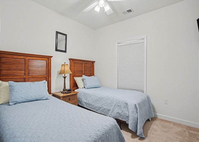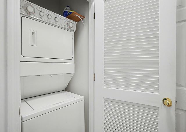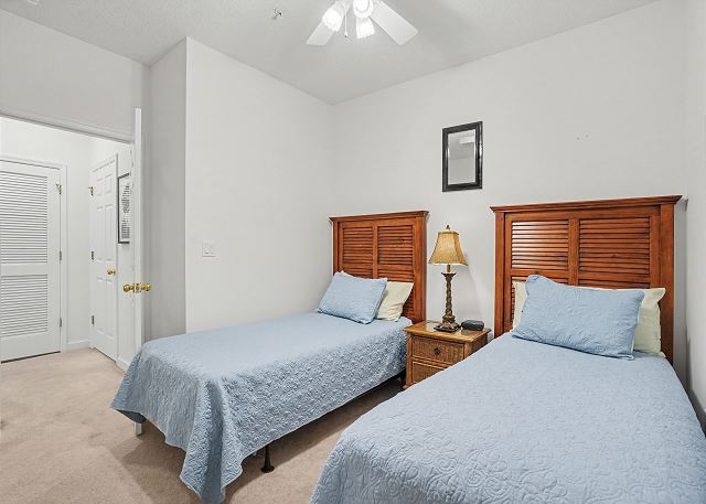 The primary bedroom has a King Swing Bed with a large walk-in closet and en-suite bathroom. The 2nd bedroom has 2 twin beds and there is another bathroom in the hallway. There is also a washer/dryer in the condo if you need to do laundry. We do provide linens and towels so just bring your beach towels.