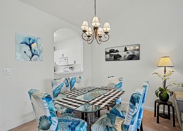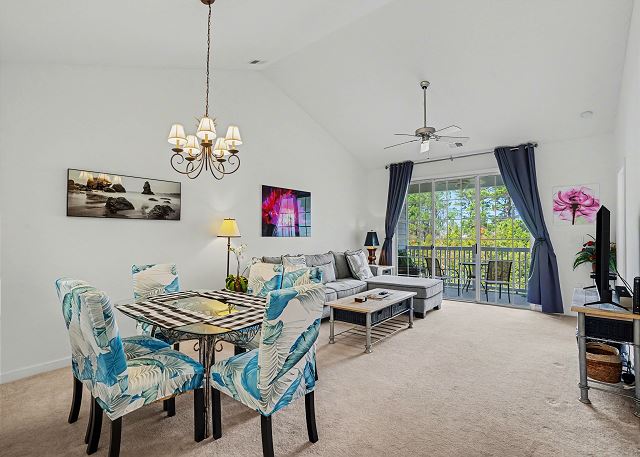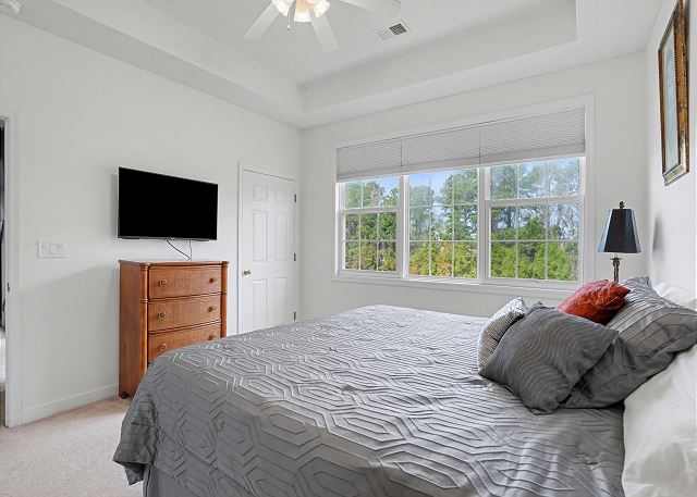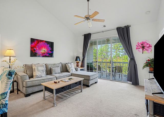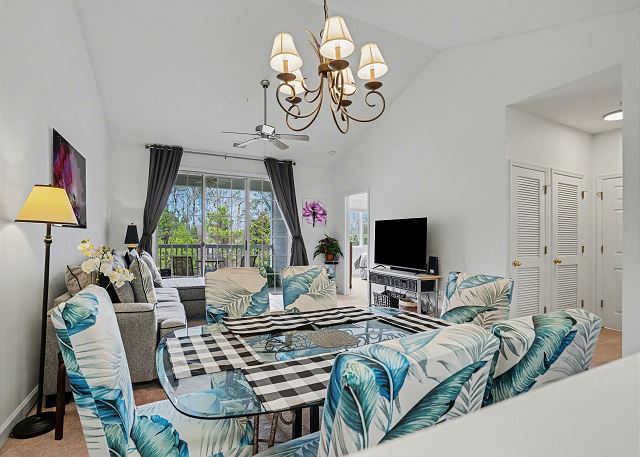 The condo has a large living room great for hosting your family or golf groups. The kitchen is fully stocked so you can cook your favorite meals. The living room area is spacious and the dining area has plenty of seating for everyone. There is a large Flat Screen TV for your viewing pleasure in the living room and both bedrooms. The balcony is right off the living room so you will be able to relax and enjoy your favorite beverage while enjoying the view.