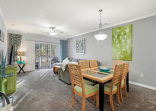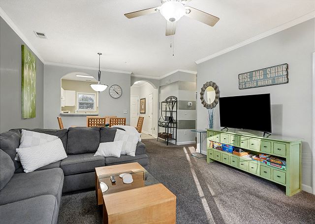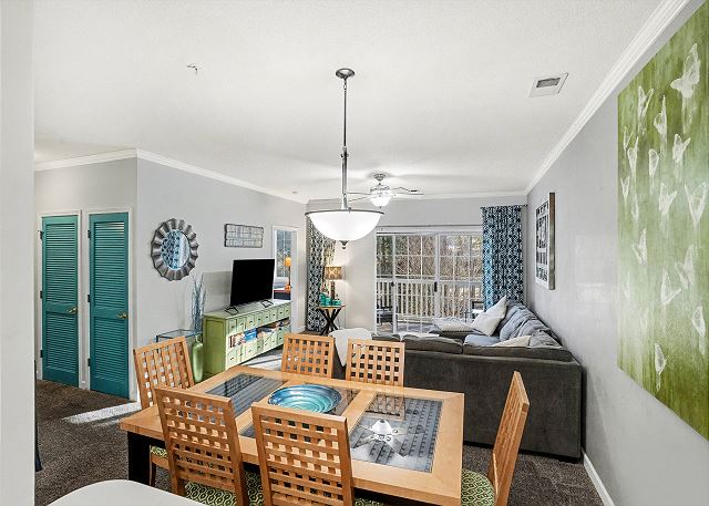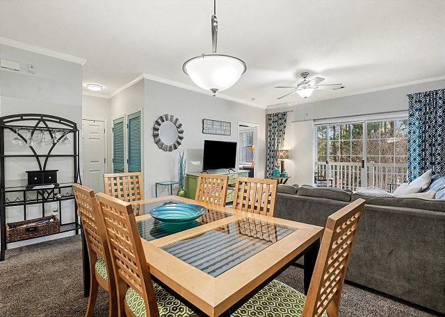 Barefoot Resort River Crossing 622 is in the ideal neighborhood in the North Myrtle Beach area’s greatest resort location. This unit is a two-bedroom, two-bath, spacious, second floor walk up condominium. This well maintained condo sleeps up to 6 guests. It's been completely updated with new furniture, new flooring and fresh paint. The primary bedroom offers 2 full beds & bath. Two twins are situated in our second bedroom. The kitchen is fully stocked and it has a washer/dryer for your use as well. This nicely decorated condo has everything you need to enjoy your vacation. There is plenty of seating for relaxing. The dining area is very spacious and you will love to cook in the kitchen.
