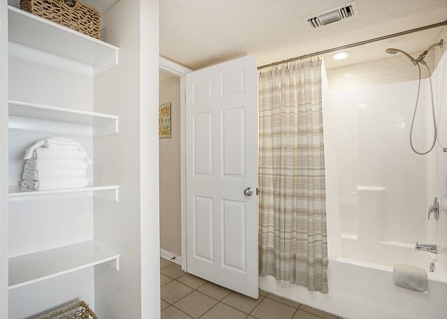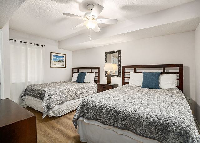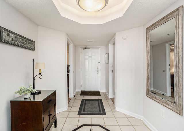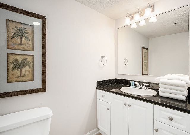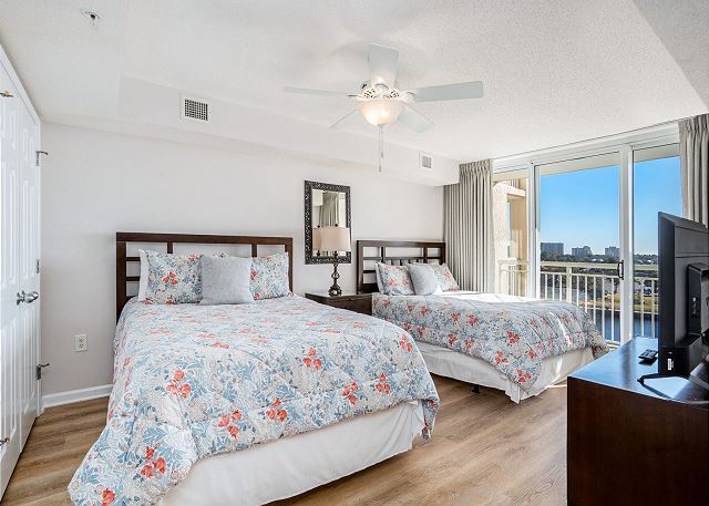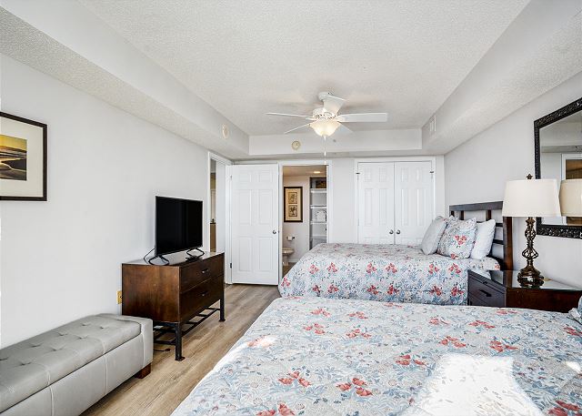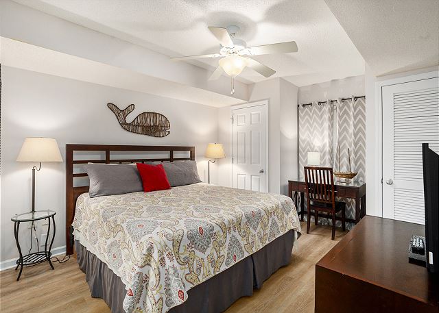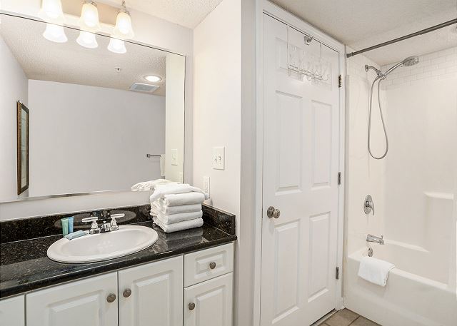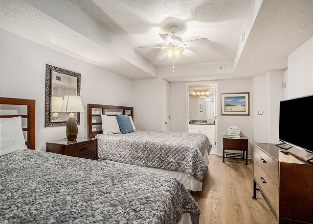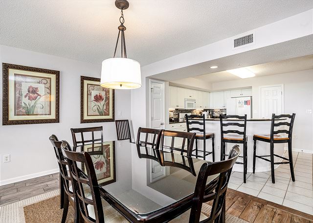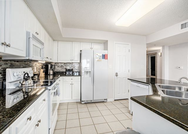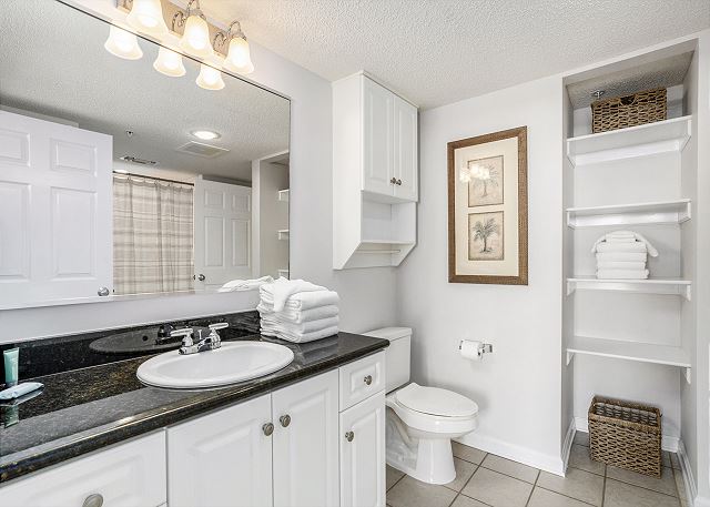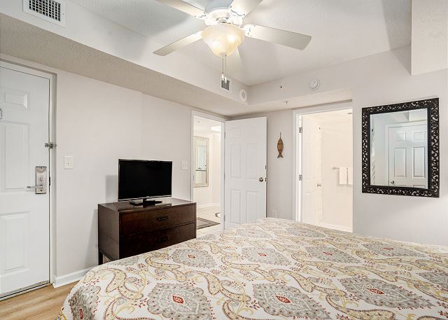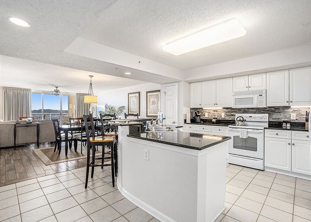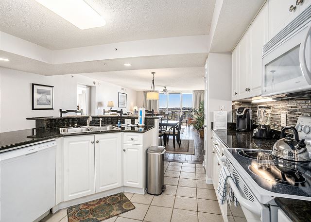 When you walk into the condo, you will see how large the condo is! It has recently been freshly painted throughout and is beautiful! The kitchen has so much space to cook your favorite meals and is fully stocked. There is a great breakfast bar that overlooks the dining area and living room. The living room has plenty of seating for everyone and has a large Flat Screen TV to watch your favorite shows. Sit out on the comfortable balcony and enjoy the views of the City and Barefoot Landing. You will feel so relaxed!