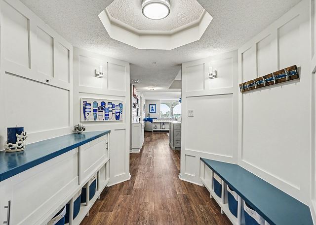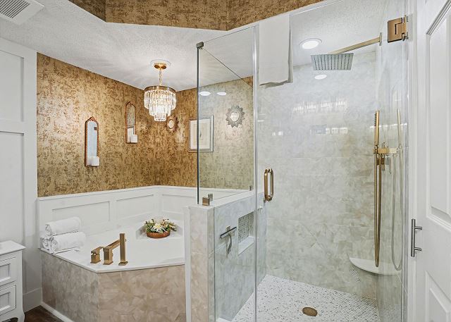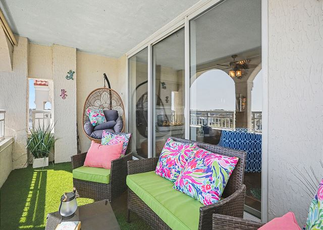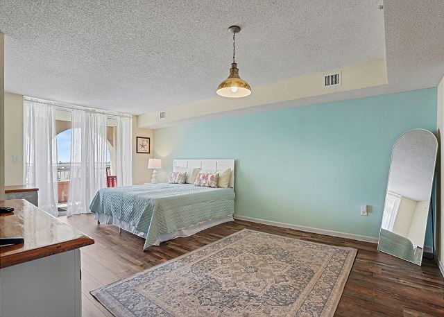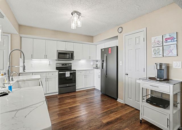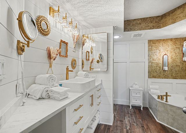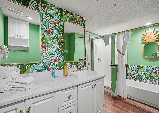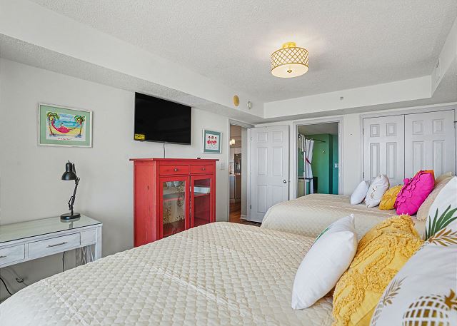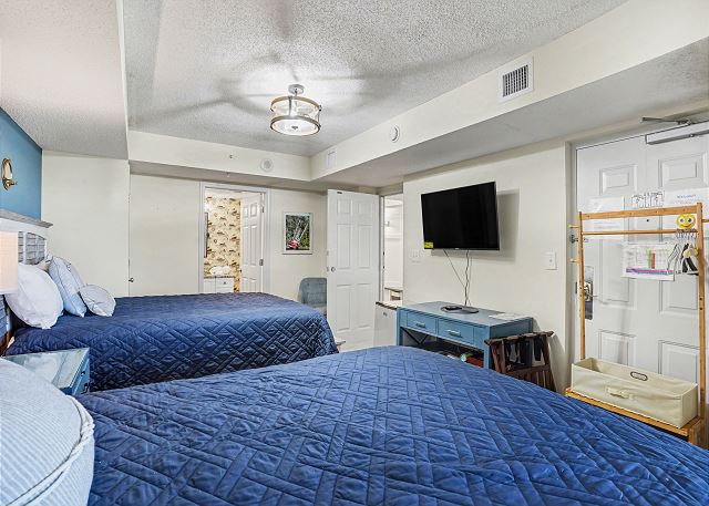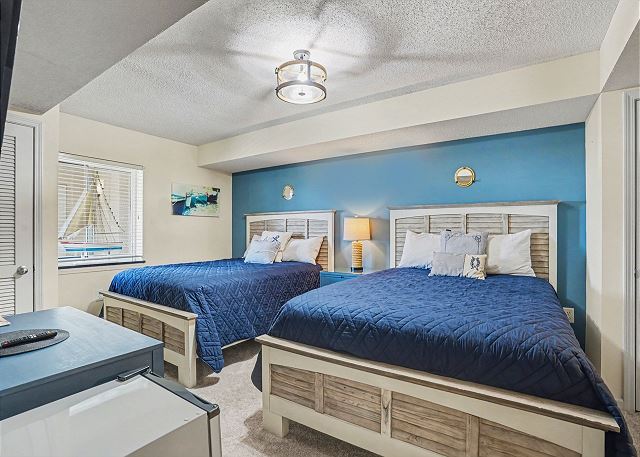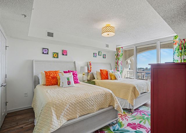There are two primary suites with adjoining primary baths and the other two bedrooms have their own bathrooms as well so everyone has privacy. There is a king bed in the 1st Primary suite and Two Queens in the 2nd Suite with its own private balcony. The 3rd bedroom has two queens and the 4th has a King too. All of the bathrooms have been updated too. The bedrooms all have flat screen TVs as well. There is a washer and dryer in the property so you can do your laundry any time you need to.